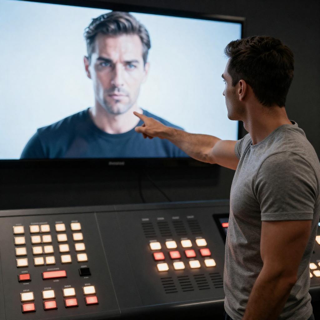 Man with short dark hair, muscular build, gray t-shirt, pointing at a screen displaying a serious-faced man. Dark control room with illuminated buttons and panels. Bright screen contrasted by dim surroundings. Right arm extended, index finger pointing. Multiple control buttons below screen.