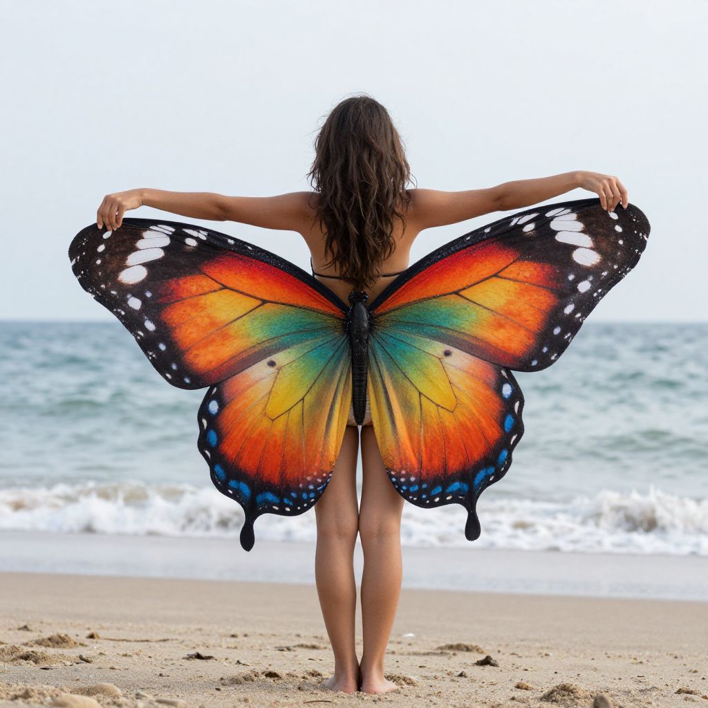 A woman stands on the beach, her back turned to the camera, as she spreads a vibrant butterfly-patterned sarong like wings, transforming her into a human-butterfly hybrid against the serene backdrop of the ocean.