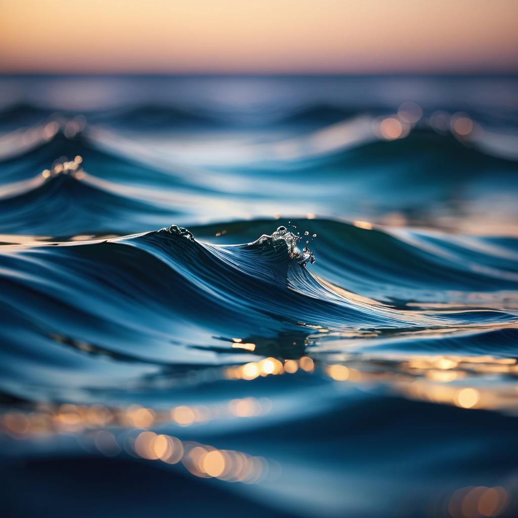 Detailed close-up shot of calm ocean waves at night with vivid reflections and bokeh lighting in the blurred background, creating a serene and atmospheric outdoor scene.