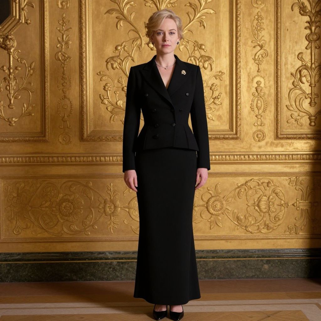 Elegantly dressed woman in a black suit stands poised against a backdrop of ornate gold walls and intricate patterns, exuding sophistication and grace reminiscent of Downton Abbey's timeless charm.
