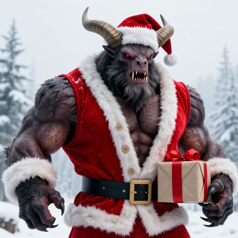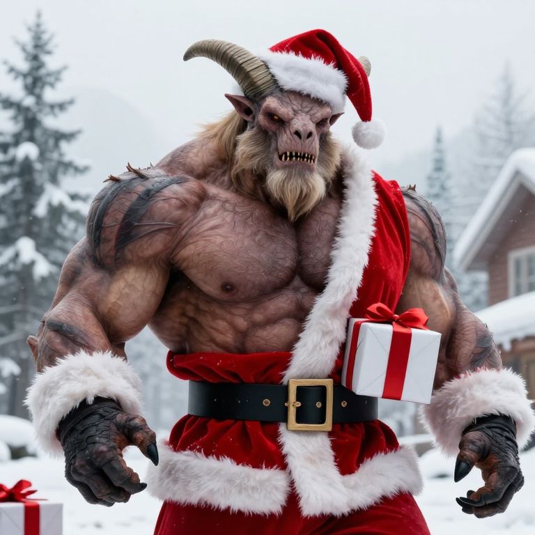 Muscular demonic Santa Claus with horns, white beard, red velvet suit, and fur trim, holding gift, in snowy, dark urban setting.