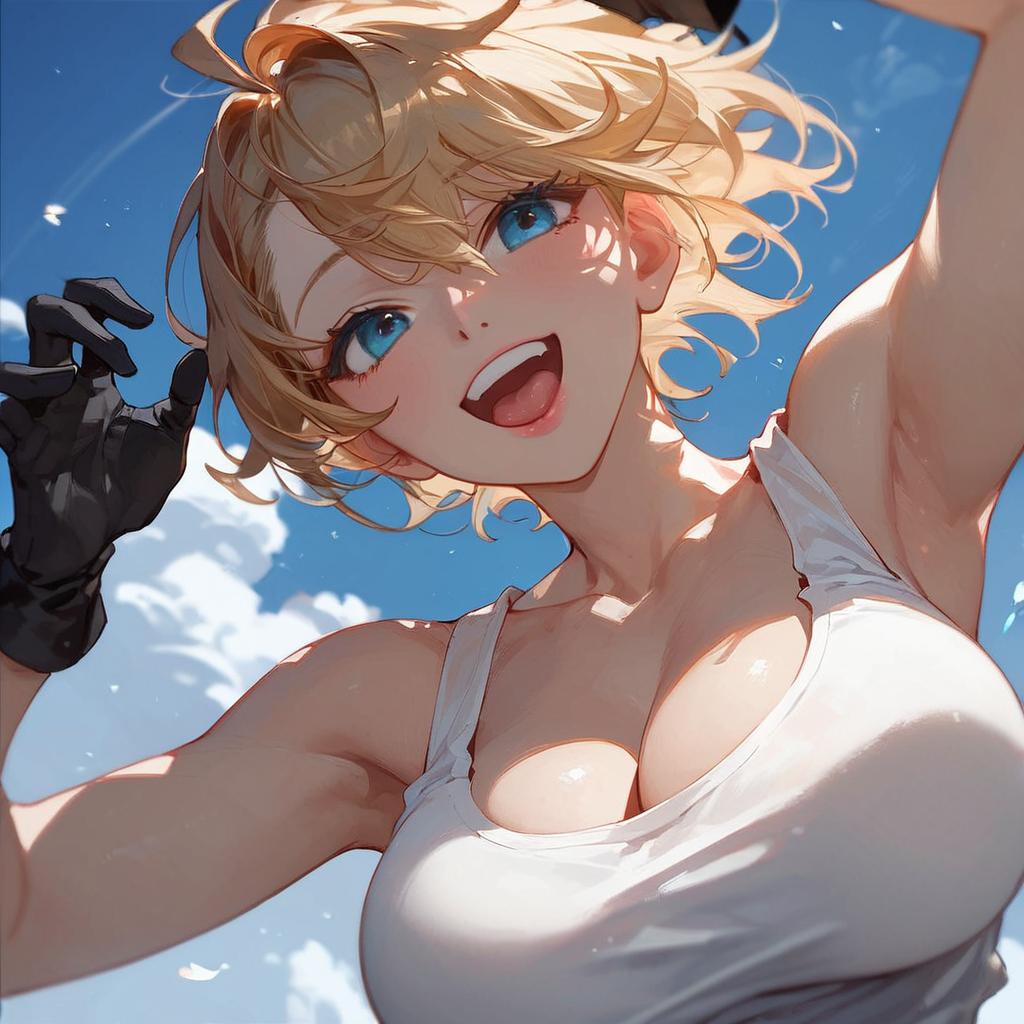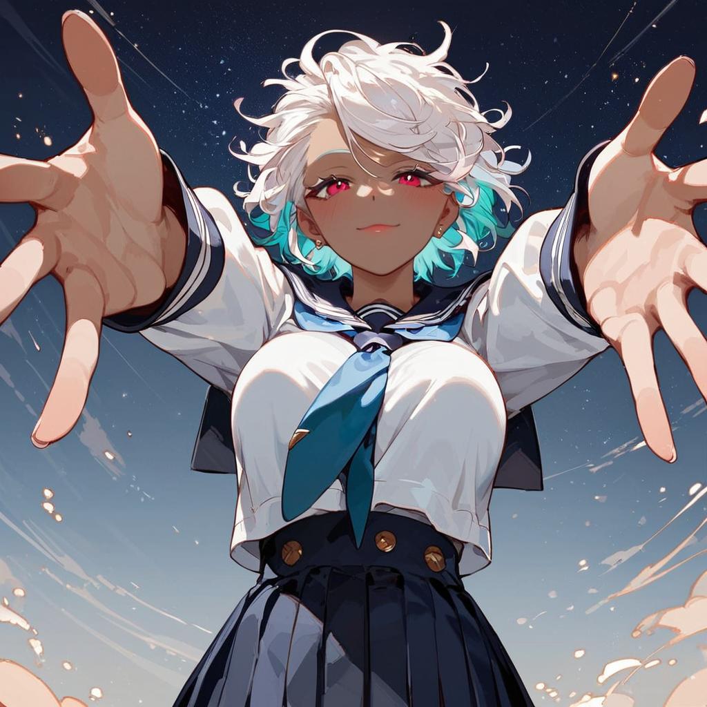 Score_9, source_anime, 1girl, light blush, dark skin, light smile, upper body, reaching out, from below, medium breasts, white hair, multicolored hair, colored eyelashes, beautiful_detailed_eyes, short hair, messy hair, green eyes, multicolored eyes, standing, looking at viewer, spread arms, school uniform, night sky, closed mouth