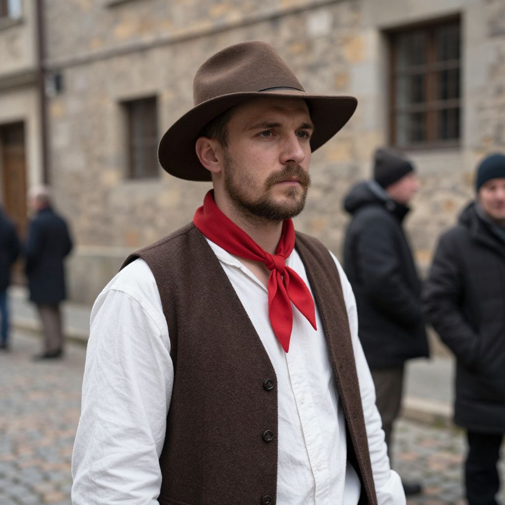 Photograph of a rugged-looking man with a short beard and mustache, wearing a brown wide-brimmed hat, white shirt, red neckerchief, and brown vest. He stands on a cobblestone street with a stone building in the background, slightly blurred. Other people are visible in the background, dressed in dark winter clothes. The overall style is rustic, historical.