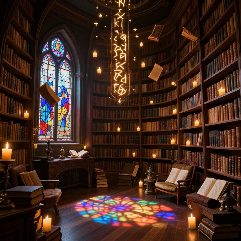 An amaizing magical library filled with floating ancient books, glowing runes, enchanted artifacts, and cozy reading nooks, illuminated by floating candles and stained glass windows casting colorful patterns on wooden floors.