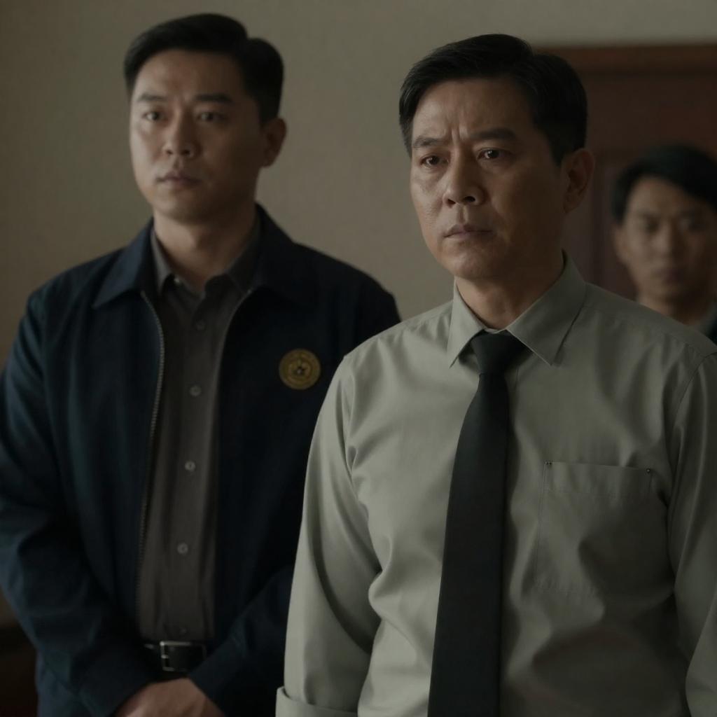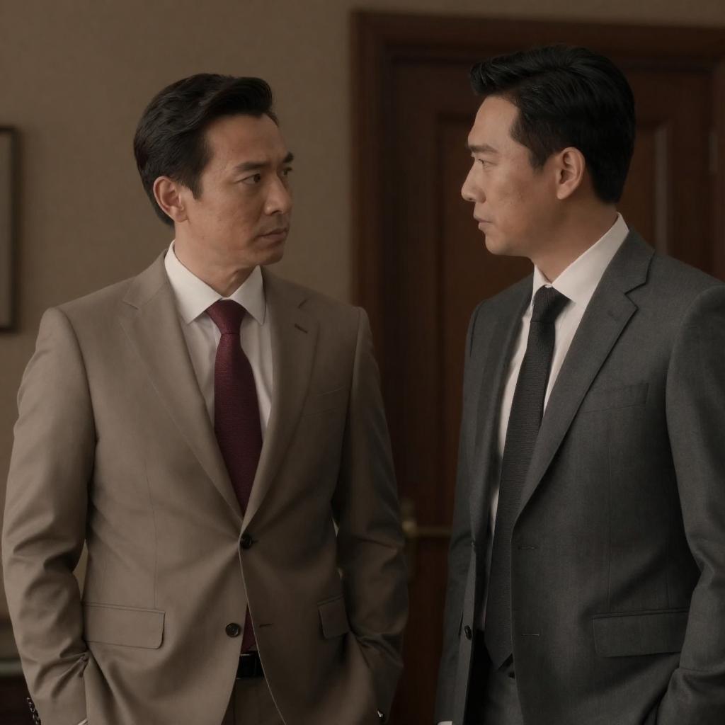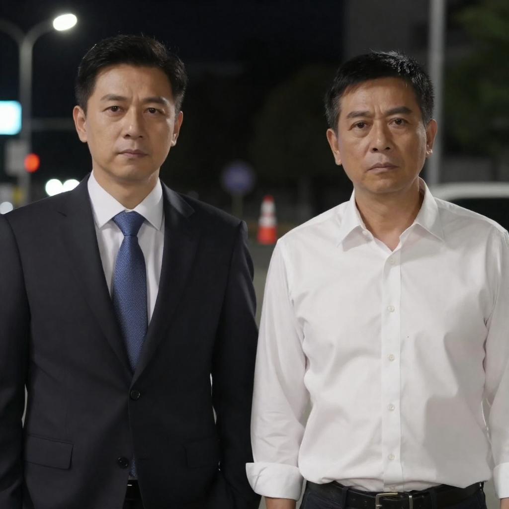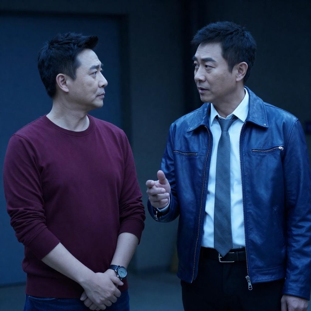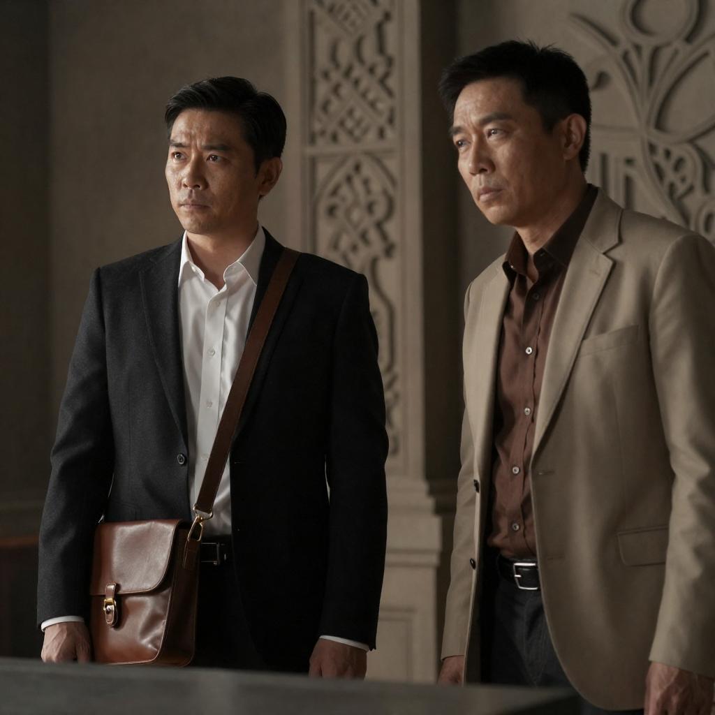 Photograph of two men walking side by side in a dimly lit, industrial-style hallway. The man on the left wears a black suit with a white shirt, while the man on the right wears a dark leather jacket over a black shirt. Both have serious expressions and short dark hair. A window with blue-tinted glass is in the background.