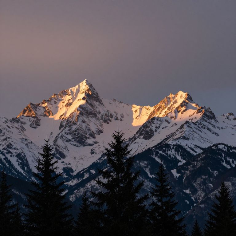 Snow-capped peaks rise majestically against a dusky sky, their jagged silhouettes bathed in soft golden light as pine trees stand sentinel in the foreground.
