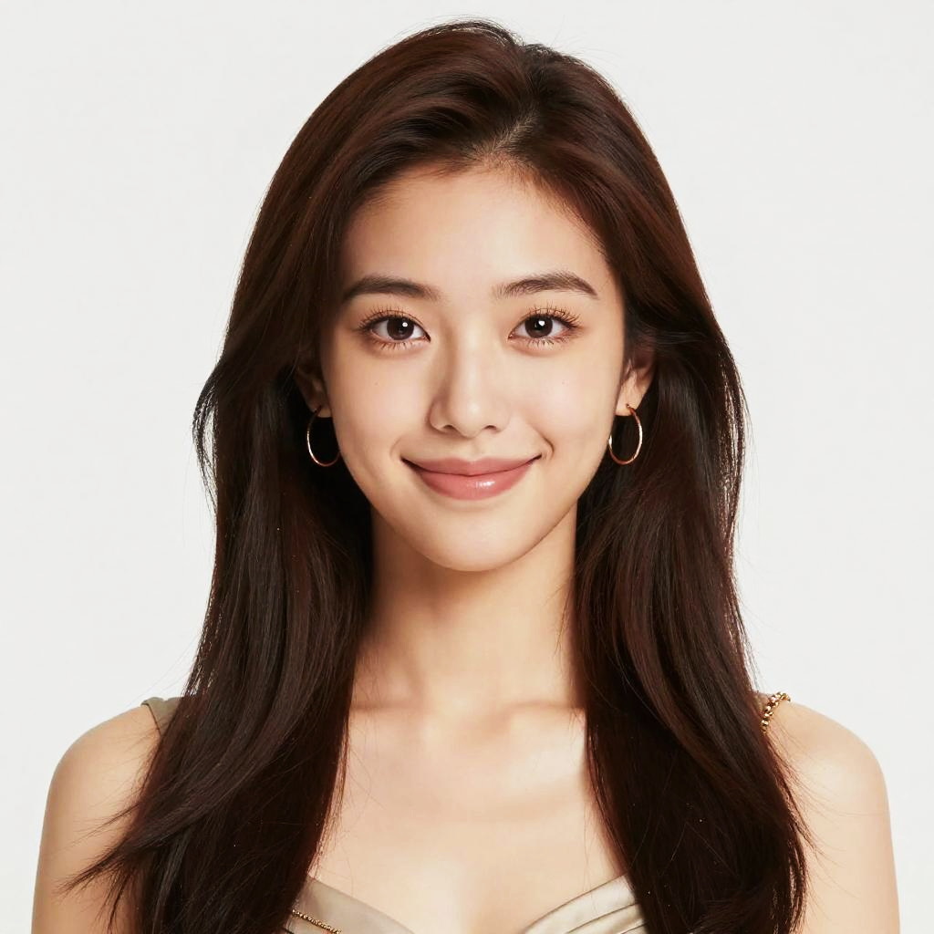 Photograph of a young Asian woman with fair skin and long, straight black hair, smiling widely while holding a black and silver Nikon DSLR camera in front of her face. She has large, almond-shaped brown eyes, well-defined eyebrows, and is wearing gold hoop earrings and a gold necklace with small rectangular pendants. Her white top contrasts with the dark background. The camera's lens is centered in the frame, and the Nikon logo is visible. The image is well-lit, highlighting her smooth skin and bright, white teeth. The overall style is modern and vibrant.