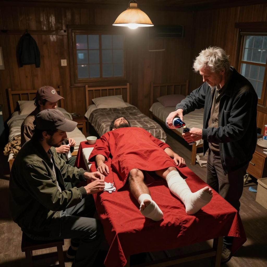 A group of five men in a dimly lit wooden cabin, attending to a man lying unconscious on a table covered with a red cloth. The injured man's legs are bandaged, while one man applies a bandage and another pours liquid onto the cloth. The setting includes three beds with blankets and pillows, wooden walls, and a hanging lamp casting warm light.