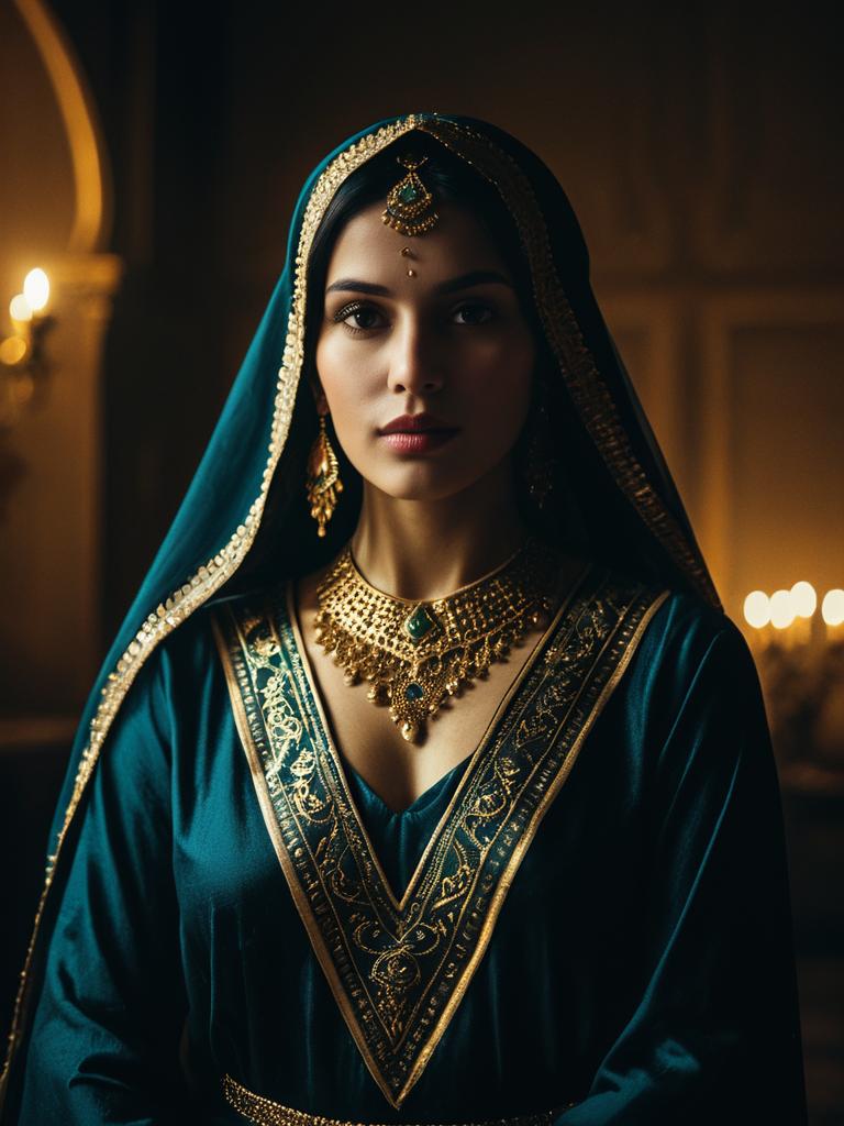 Woman in Arabian Dress, cinematic realism, regal editorial photo --sref 1391