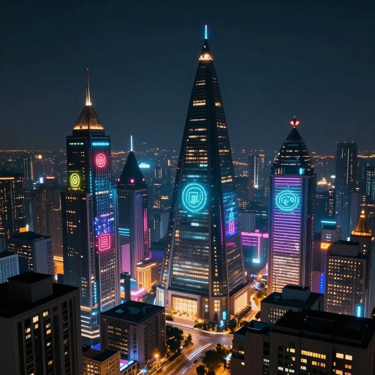 Illuminati-inspired futuristic cityscape at night, towering pyramidal buildings with glowing eyes on top, neon lights and holographic symbols in a cyberpunk aesthetic, richly detailed and atmospheric