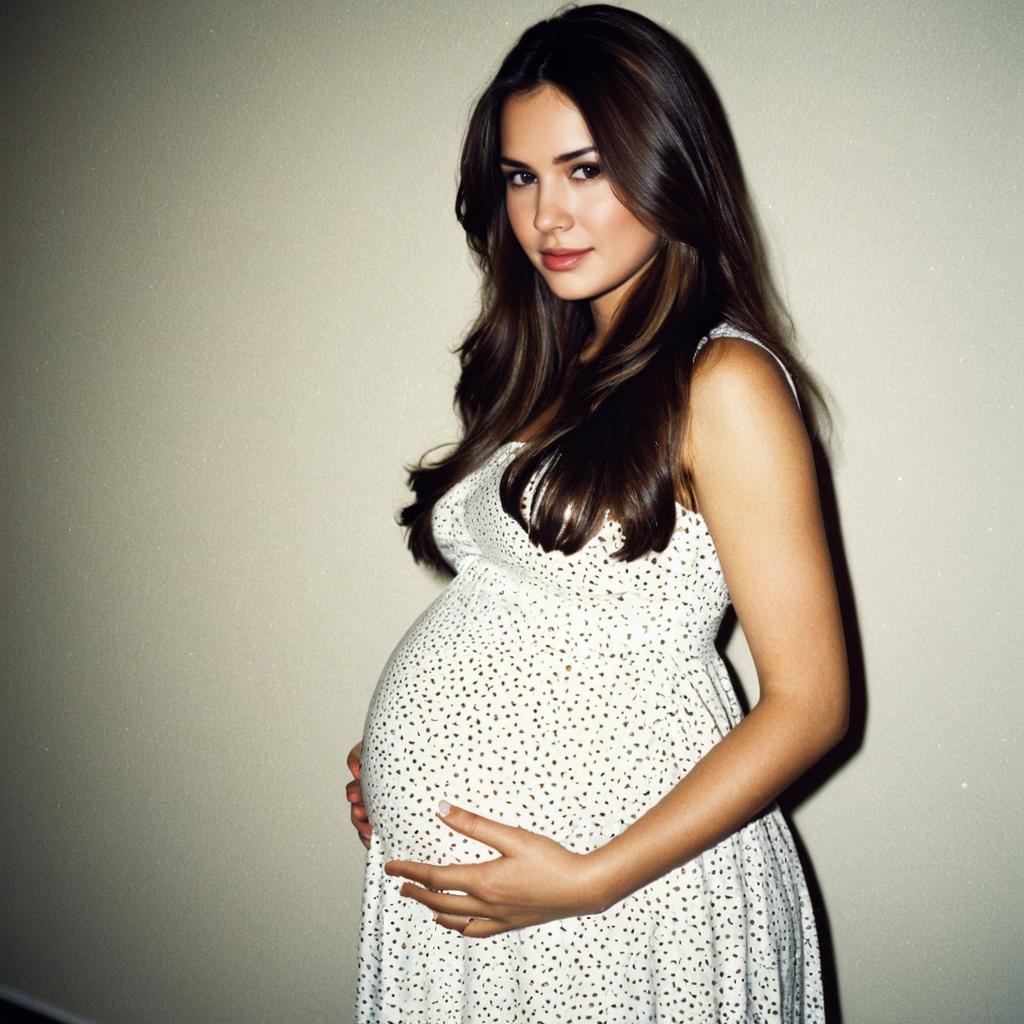 Fall maternity ,1girl, solo, dress, long hair, tree, realistic, outdoors, photorealistic, standing, white dress, pregnant, long sleeves, black hair, looking at viewer, autumn leaves, autumn, blurry