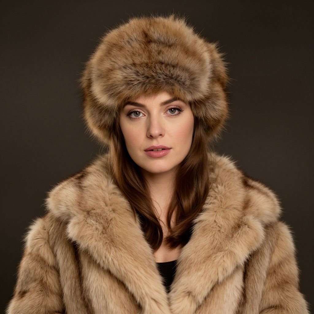 Photograph of a woman with fair skin and brown eyes, wearing a brown fur hat and coat, against a black background.