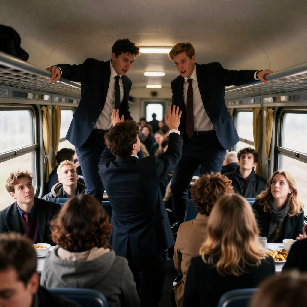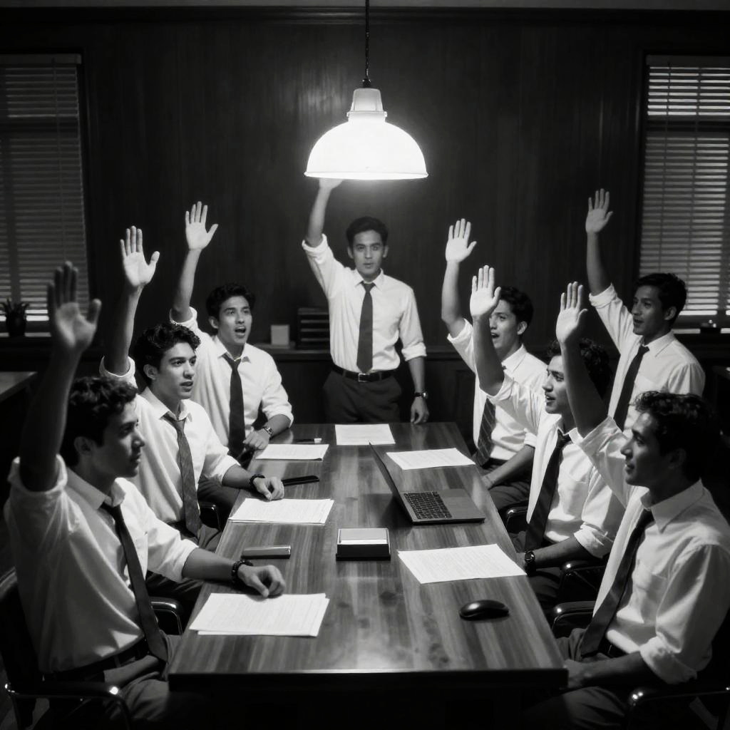 Black and white photograph of five men in a diner. Central man in suit with tie, sitting, looks at another man standing with arms outstretched. Two men seated, one with raised arm, facing standing man. One man standing, facing central seated man. Poker chips and cards on table. Large window in background.