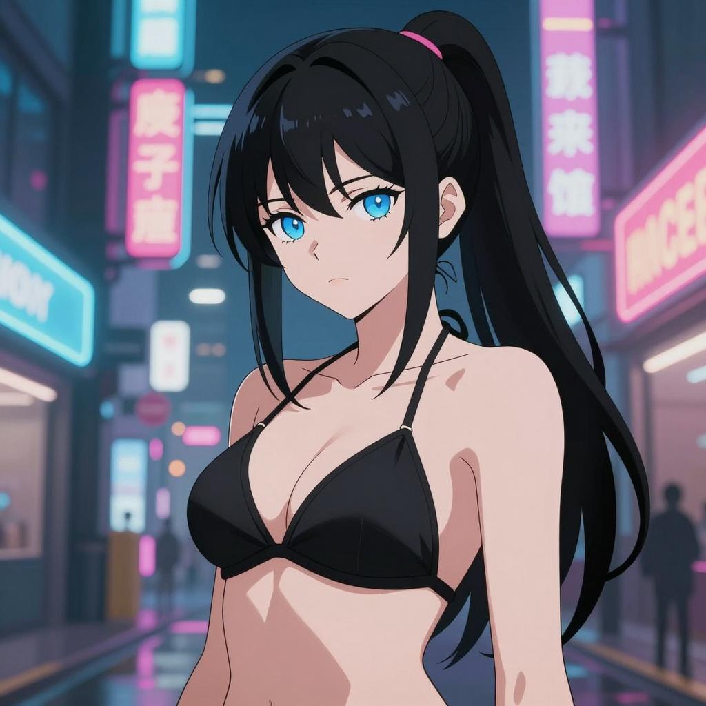 A young woman with purple hair styled in a bun, wearing a yellow floral summer dress with spaghetti straps, standing outdoors in a vibrant market street setting during sunset, soft warm lighting illuminating her face, detailed anime style with expressive blue eyes, bustling market stalls and lanterns in the background, warm color palette with purple and yellow hues