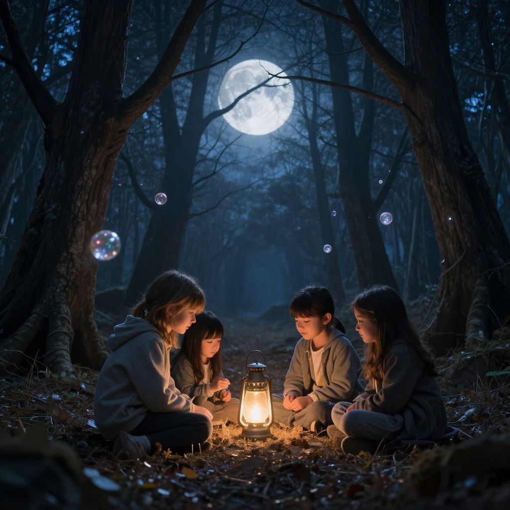 Photograph of five children holding hands, walking through a rocky canyon at sunset, with glowing orange lanterns floating above.