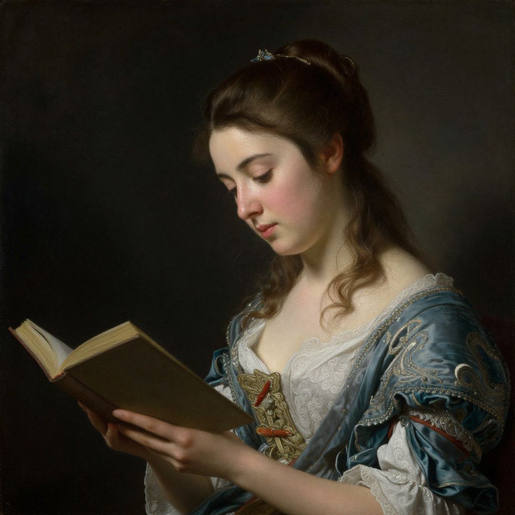 A classical oil painting by Jean Honoré Fragonard depicts a young woman engrossed in reading a book, her delicate features illuminated by soft, natural light against a dark background, showcasing the artist's masterful use of chiaroscuro and attention to detail in capturing the essence of Enlightenment-era elegance.