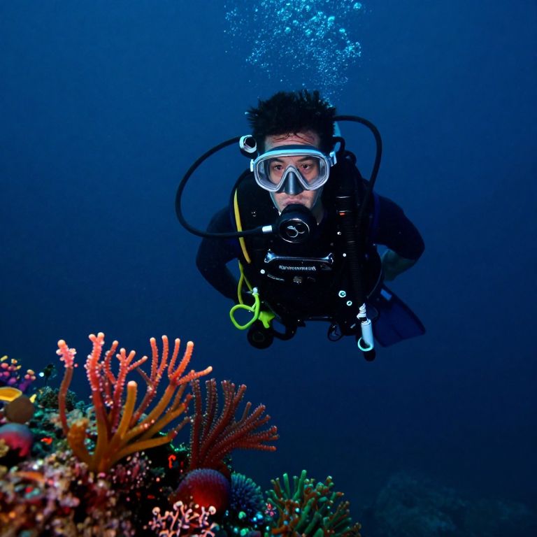 Photograph of a scuba diver underwater, centered in the image. The diver, wearing a black wetsuit, mask, and oxygen tank, has a focused expression. He is surrounded by a deep blue ocean. In the foreground, vibrant coral reefs with orange, red, and green corals are illuminated by underwater light. Bubbles rise from the diver's mouth, adding a dynamic feel. The background is a smooth gradient of blue, enhancing the contrast with the colorful coral. The diver's hands are slightly visible, gripping the tank's hose.