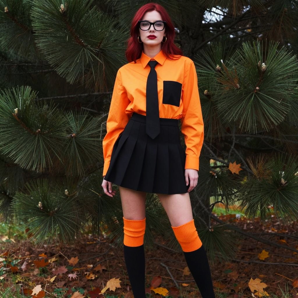 A woman with red hair and black-framed glasses stands confidently outdoors against a backdrop of dense pine trees and fallen autumn leaves. She is wearing a stylish orange collared shirt with black accents, a short black pleated skirt, and matching orange and black knee-high socks, embodying a bold and modern fashion look.