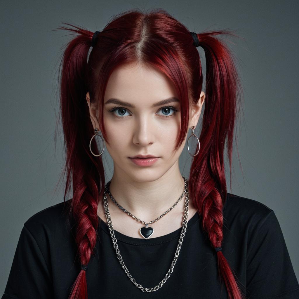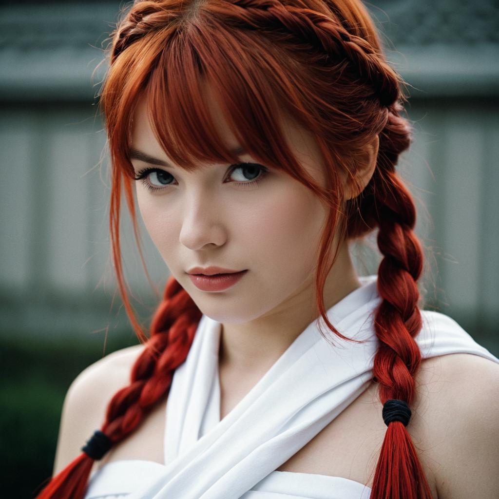 Jumbo braids red,1girl, solo, jewelry, necklace, long hair, looking at viewer, realistic, red hair, earrings, multiple braids, blurry background, upper body, blurry, braid, shirt