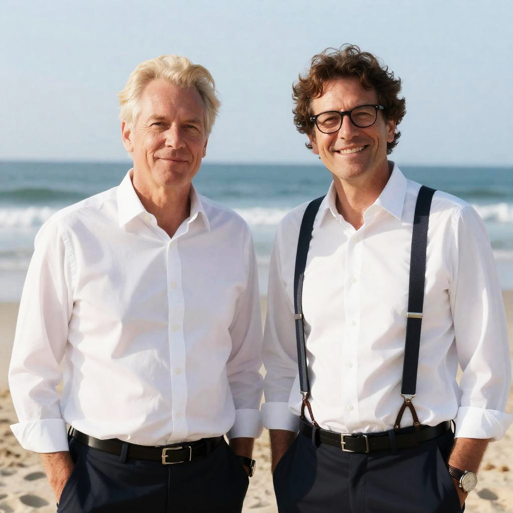 Middle-aged man with light skin, short blond hair, smiling, wearing dark suit, light gray tie, white rose boutonniere, holding glass. Background: blurry marina with boats, man in brown sweater and blue jeans. Bright sunlight. Two people.