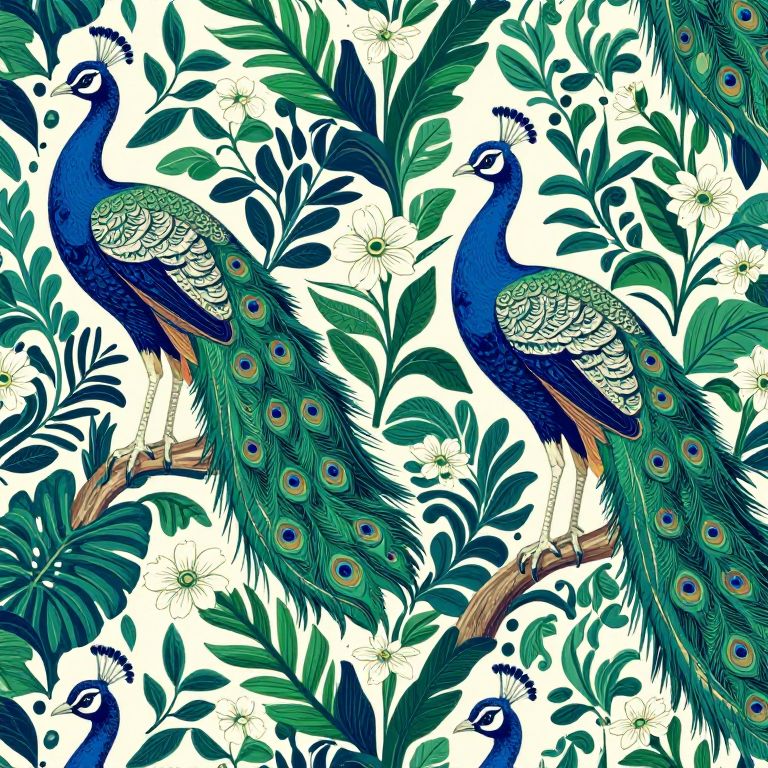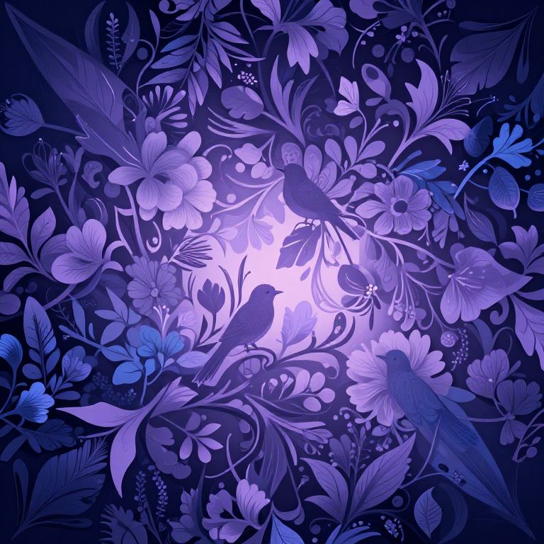 A mesmerizing illustration of intricate floral patterns in shades of amethyst and sapphire, gracefully intertwining with slender leaves and the silhouettes of perched birds, The background transitions from a deep navy to a gentle lavender hue, evoking an atmosphere of mystique and enchantment, The delicate balance of light and shadow creates a sense of wonder and curiosity, inviting the viewer to explore the hidden depths of this magical world, f4nt4st1c