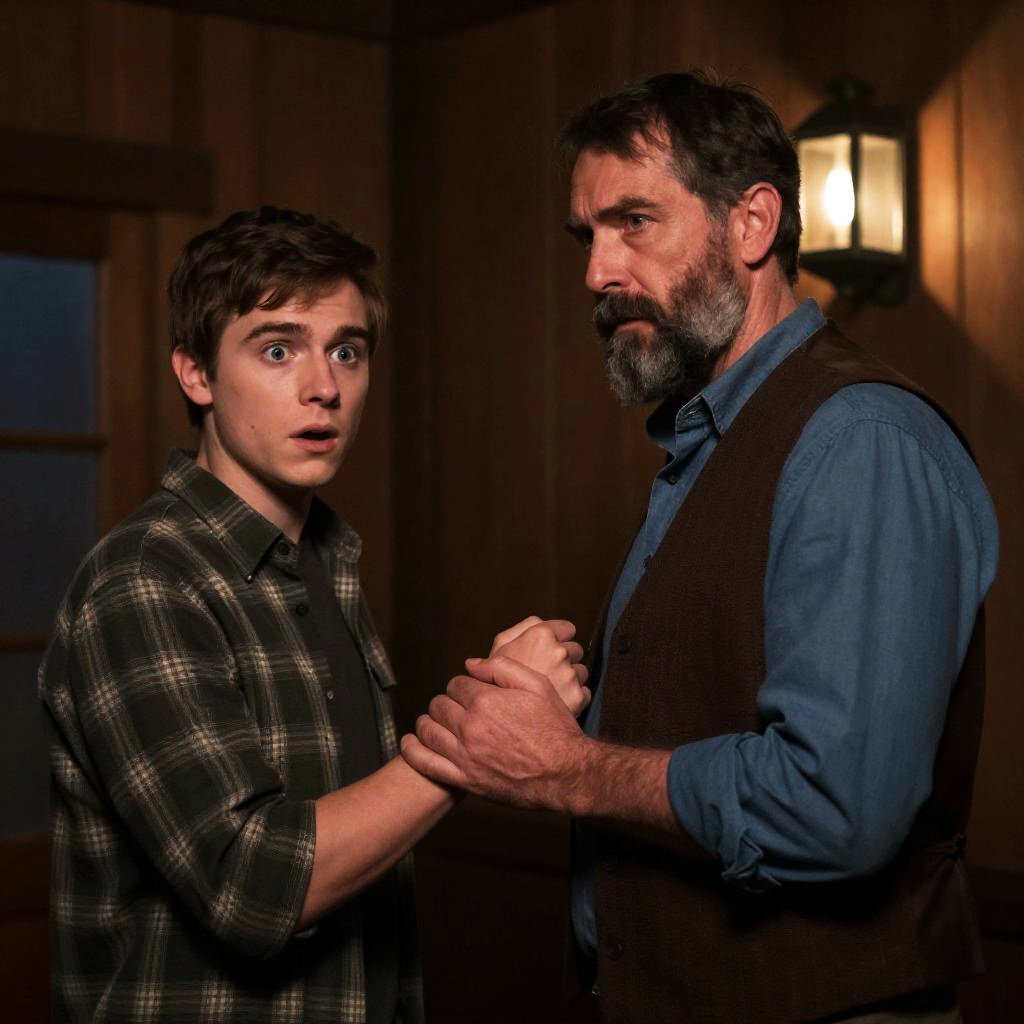 Photograph of two men in a dimly lit wooden room. Older man with dark hair, beard, blue shirt, brown vest, intense expression, holding younger man's wrist. Younger man with short brown hair, green plaid shirt, surprised expression. Lantern on wall in background.