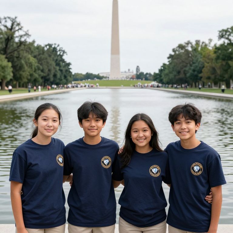 Four enthusiastic Grade 8 students stand arm-in-arm in front of the iconic reflecting pool and Washington Monument, proudly wearing matching navy T-shirts with a distinctive logo, symbolizing their memorable trip to Washington, D.C.