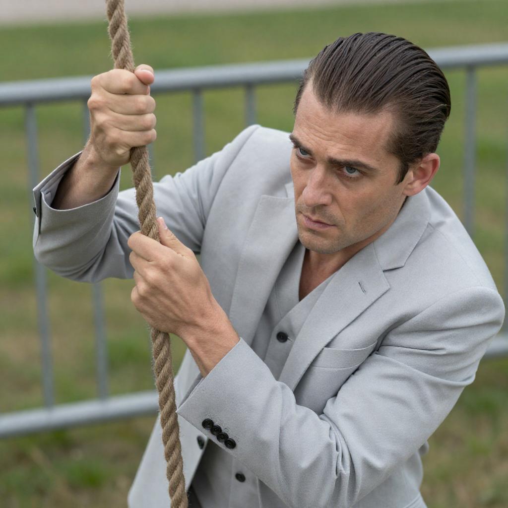 Photograph of a man with slicked-back dark hair, light blue eyes, and intense expression, wearing a light gray suit, gripping a thick rope with both hands. He is leaning forward, looking upward. Background shows blurred green grass and a metal fence. Daylight illuminates the scene.