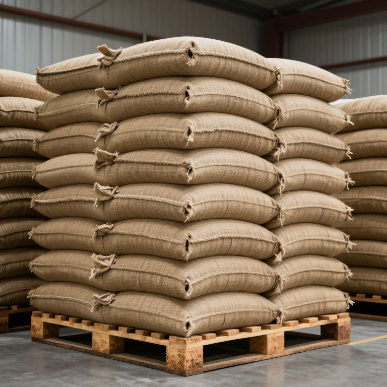 Pallets of Coffee in Jute Bags Stacked in a Warehouse