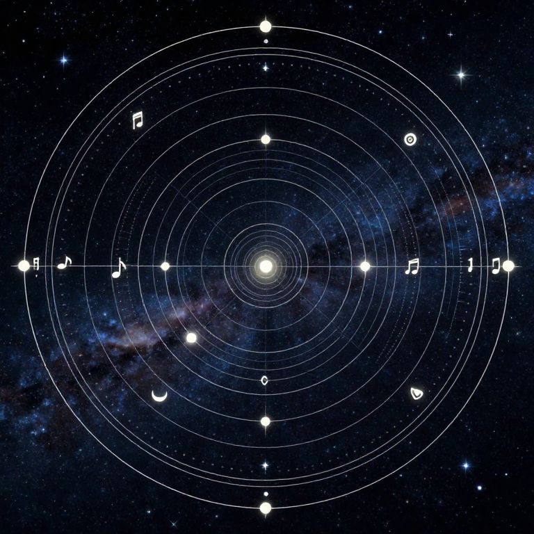 A star maps itself by singing tonal patterns—each note births orbiting celestial symbols, charting the universe in harmonic resonance.