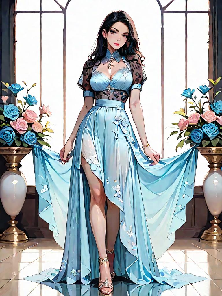 1girl, realistic face, Sheer black mesh short sleeve dress, fitted bodice, flowing A-line skirt, delicate lace trim, subtle floral embroidery, sheer overlay, lightweight chiffon, paired with strappy nude heels, minimalistic gold jewelry, elegant clutch bag.
