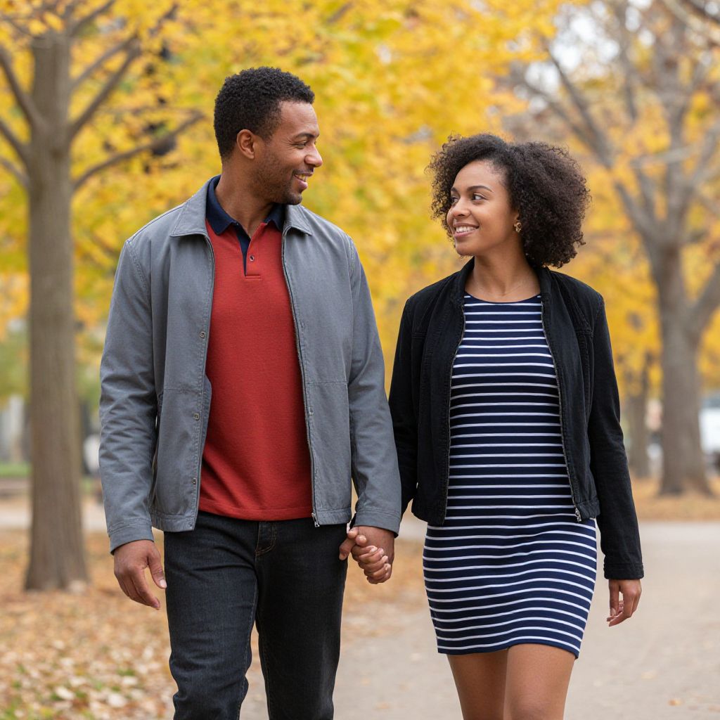 Photograph of a smiling Black couple walking hand-in-hand through a park with autumn trees. The man has short curly hair, wears a gray jacket over a red shirt, and dark jeans. The woman has a curly afro, wears a navy blue striped dress with a black jacket. The background shows a row of trees with vibrant yellow leaves. They're both looking at each other, enjoying the moment.
