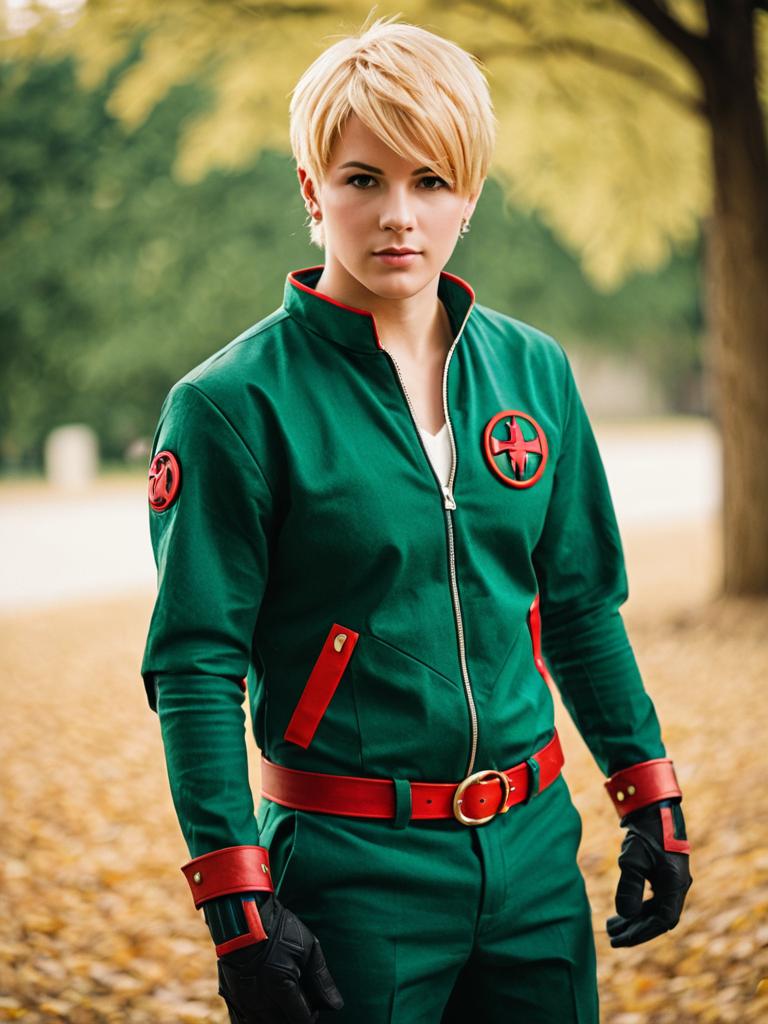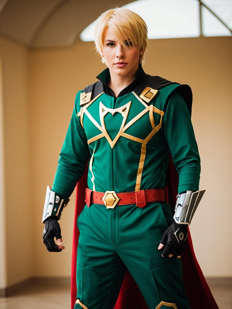Photo-realistic cosplay photo of person standing in jason (fate) costume. 1boy, green eyes, blonde hair, short hair, earringsfull body shot. lifestyle stock photo, shallow depth of field, lifestyle stock photography, shallow depth of field, natural lighting, warm tones, soft background blur, vibrant colors, realistic textures