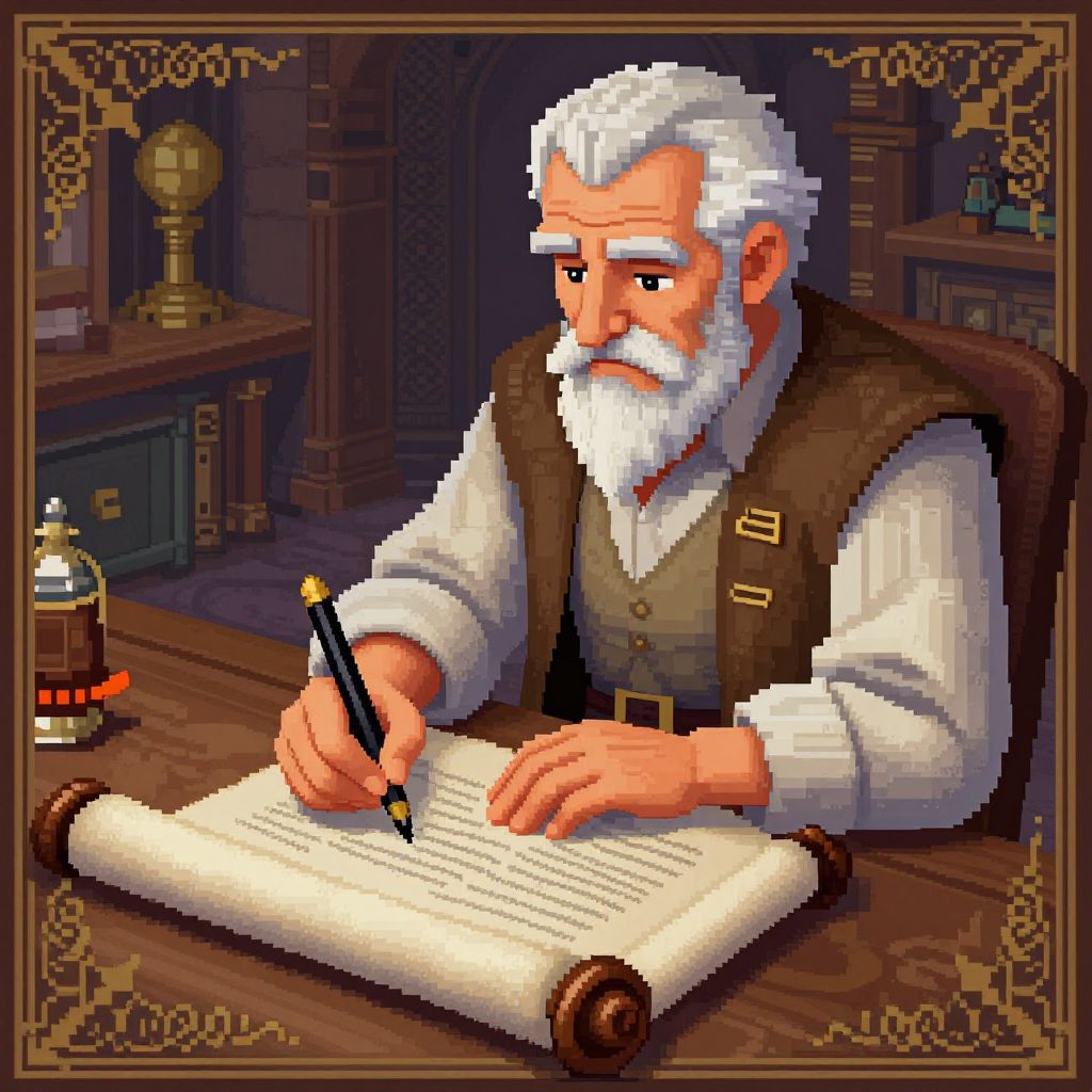 Pixel art of an elderly white-bearded man with a serious expression, writing on parchment with a quill in a dimly lit, medieval-style study
