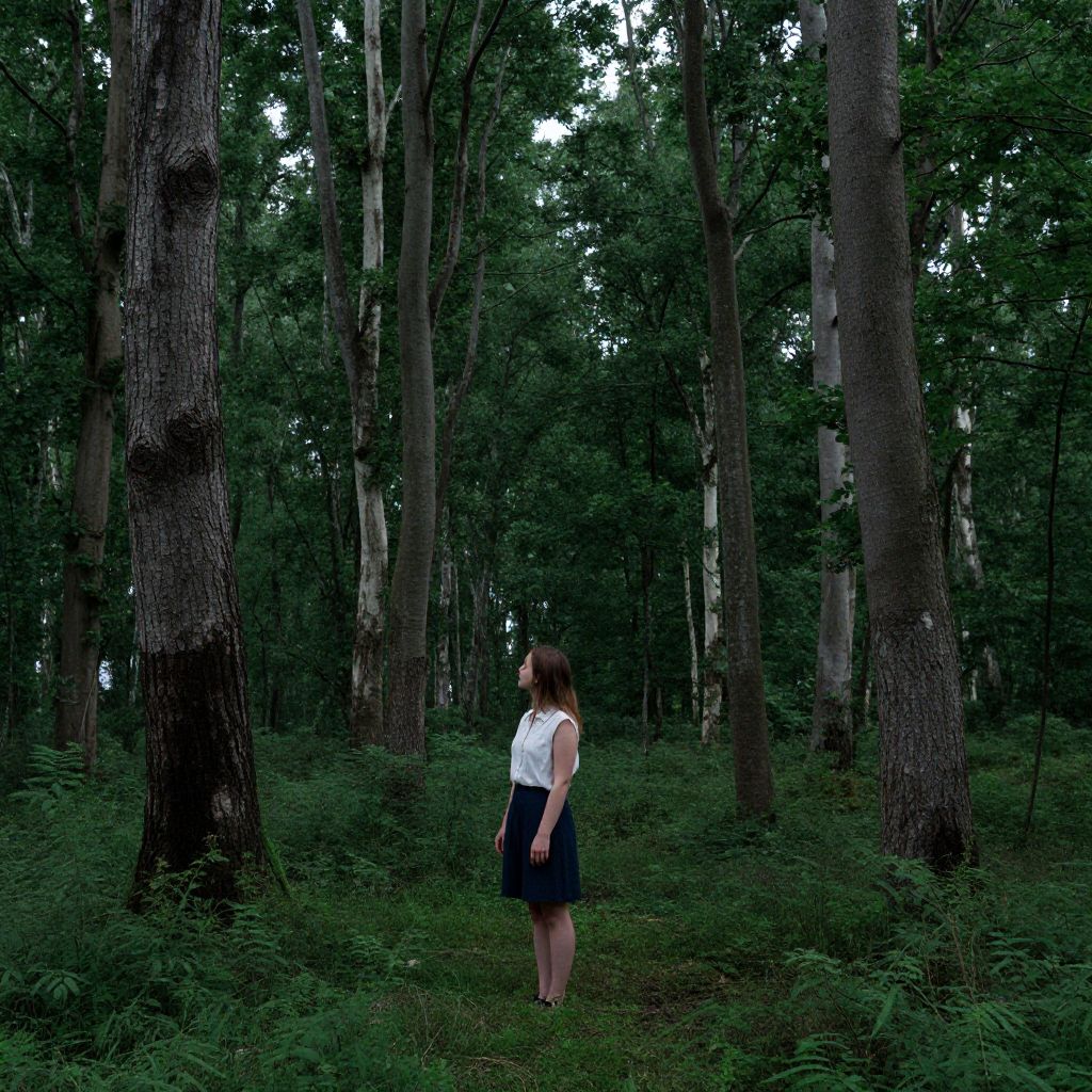 Woman standing in a deep green forest in the surroundings of Tallinn, Estonia.
