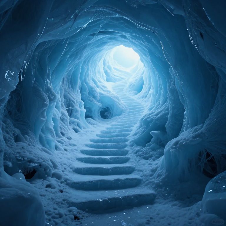 Spiraling steps ascend through a cavernous tunnel of icy blue hues, leading toward a radiant light source that casts an ethereal glow, suggesting a timeless journey into an otherworldly realm.