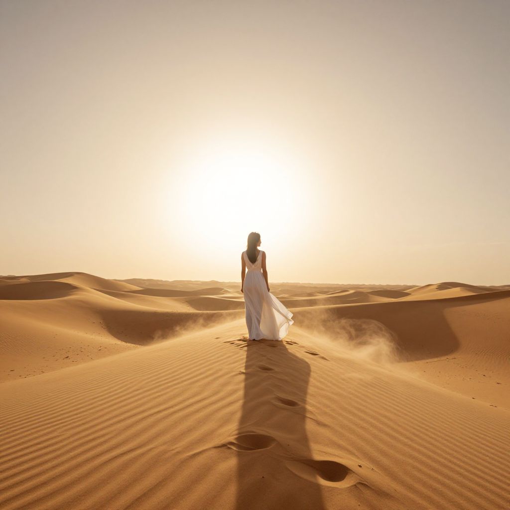 Woman in flowing white dress stands atop a golden sand dune, her silhouette framed by swirling dust clouds as she gazes into the vast, sunlit expanse of the desert.