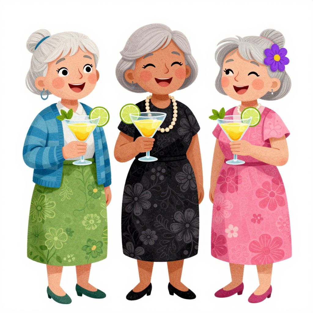 Cartoon-style illustration of three elderly women with gray hair, smiling, wearing floral dresses and holding cocktails with lemon slices.