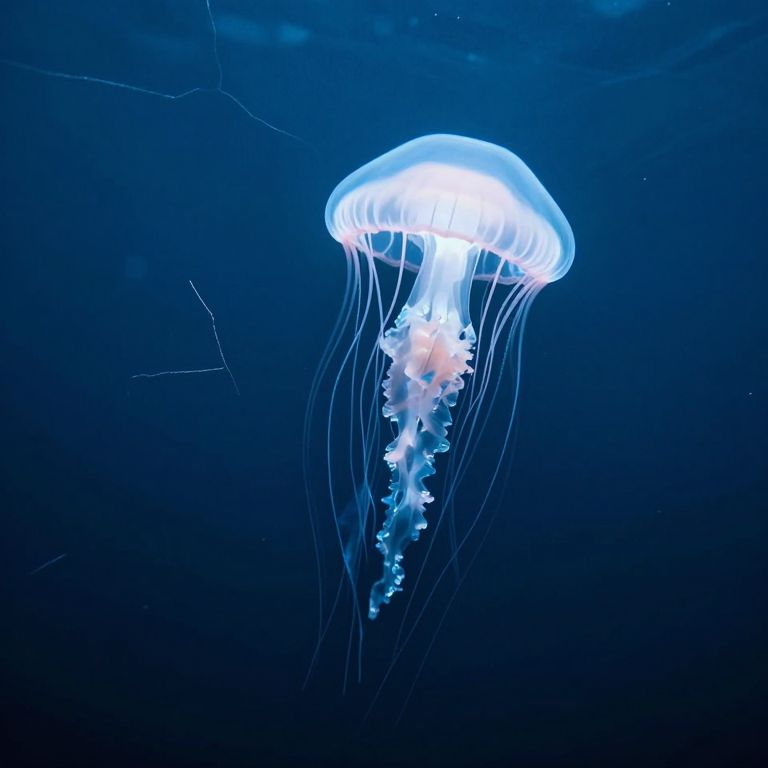 Suspended in the abyssal embrace of a fractured ocean, ethereal jellyfish with crystalline tentacles cast a luminous glow upon an inverted city, evoking a surreal dance of serenity and solitude beneath the weightless depths.