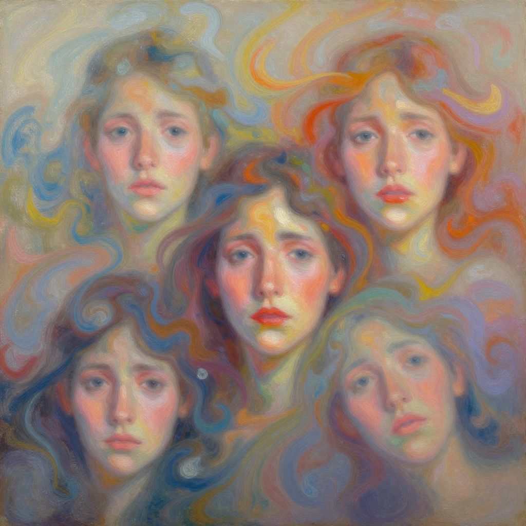 Feelings depicted as a vibrant abstract painting with swirling colors blending into each other, symbolizing the complexity and depth of human emotions, with soft light effects and fluid brush strokes creating a dreamy atmosphere.