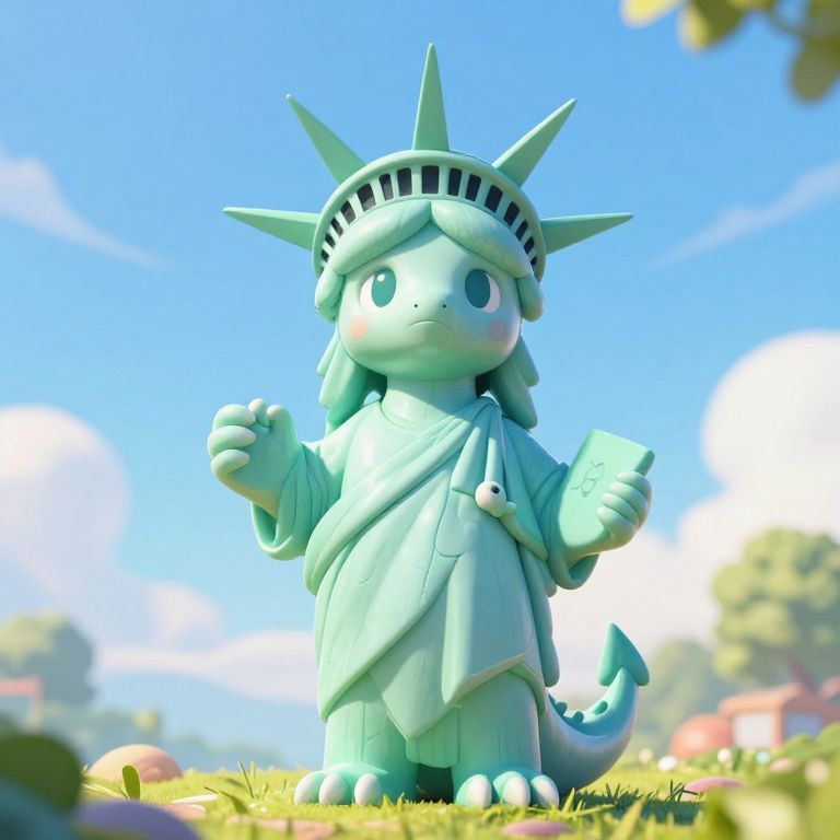 CGI image of a cute, chibi-style, green, dinosaur-like Statue of Liberty character standing on grass with a bright blue sky background.