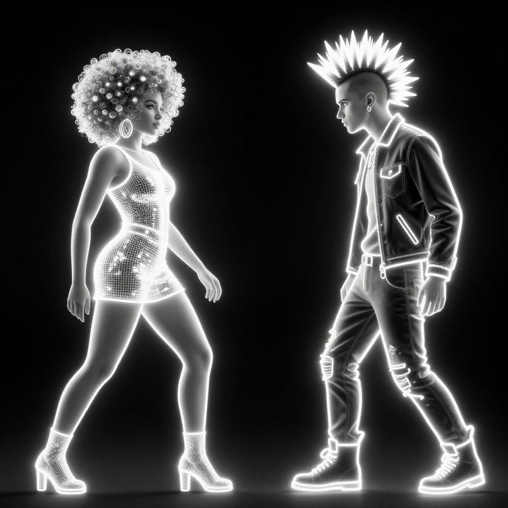 Digital artwork of two neon-lit, white-outlined figures: a curly-haired woman in a sparkly dress and high heels, facing a spiked-haired