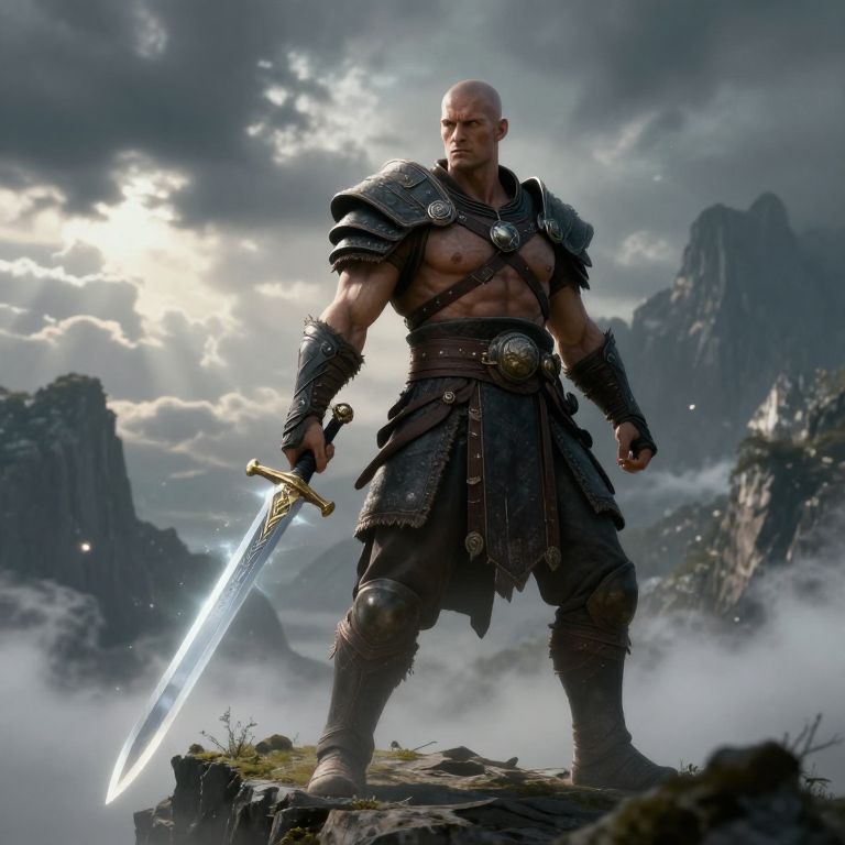 Photorealistic digital artwork of a bald, bearded warrior in medieval armor, wielding a spear. He has a muscular build and is in a dynamic, battle-ready pose. His armor is dark, with intricate engravings and metal plates, and he wears fur boots and a belt with a large circular buckle. Behind him, other armored warriors with helmets and spears charge forward. The background features a cloudy sky and a medieval castle with a flag. Dust and rocks are scattered on the ground, adding to the chaotic battle scene. The lighting is dramatic, highlighting the warrior's intense expression.