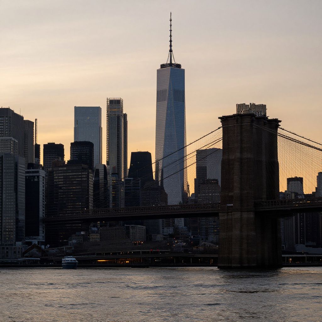 Photograph of a city skyline at sunset, featuring the illuminated One World Trade Center towering in the background. Silhouetted skyscrapers of varying heights surround the building. In the foreground, the Brooklyn Bridge spans a calm river, with its dark, textured stone pillars and cables sharply defined against the soft, gradient sky transitioning from yellow to blue. The water below reflects the fading light. The overall composition highlights the contrast between the urban architecture and the natural light, creating a dramatic and serene cityscape.