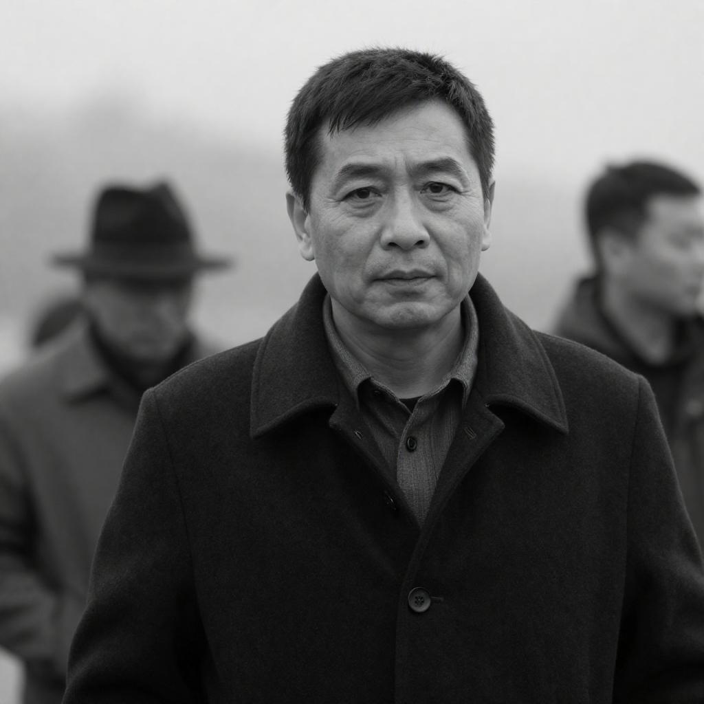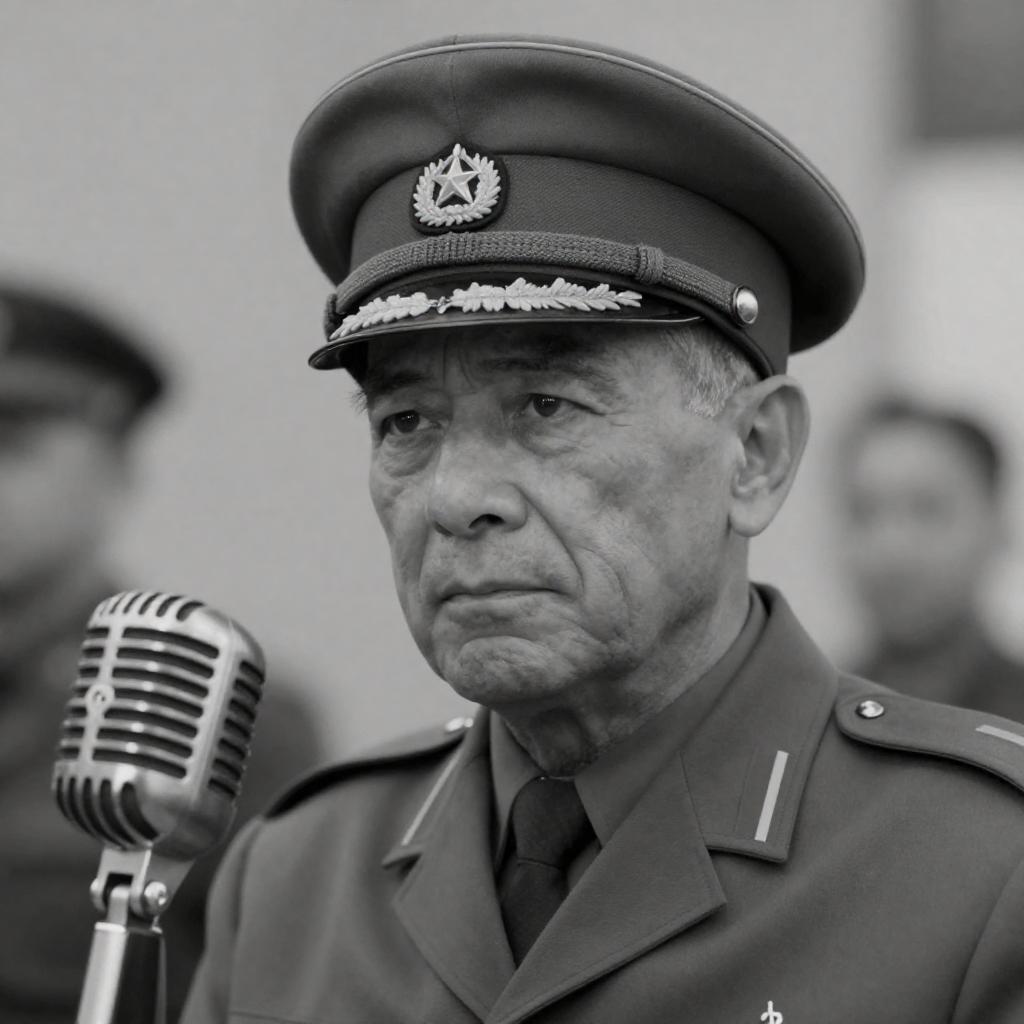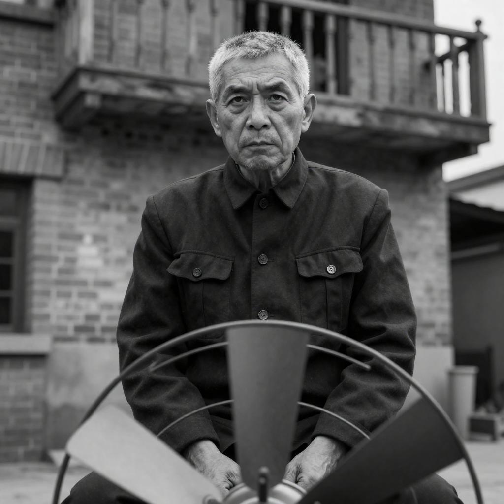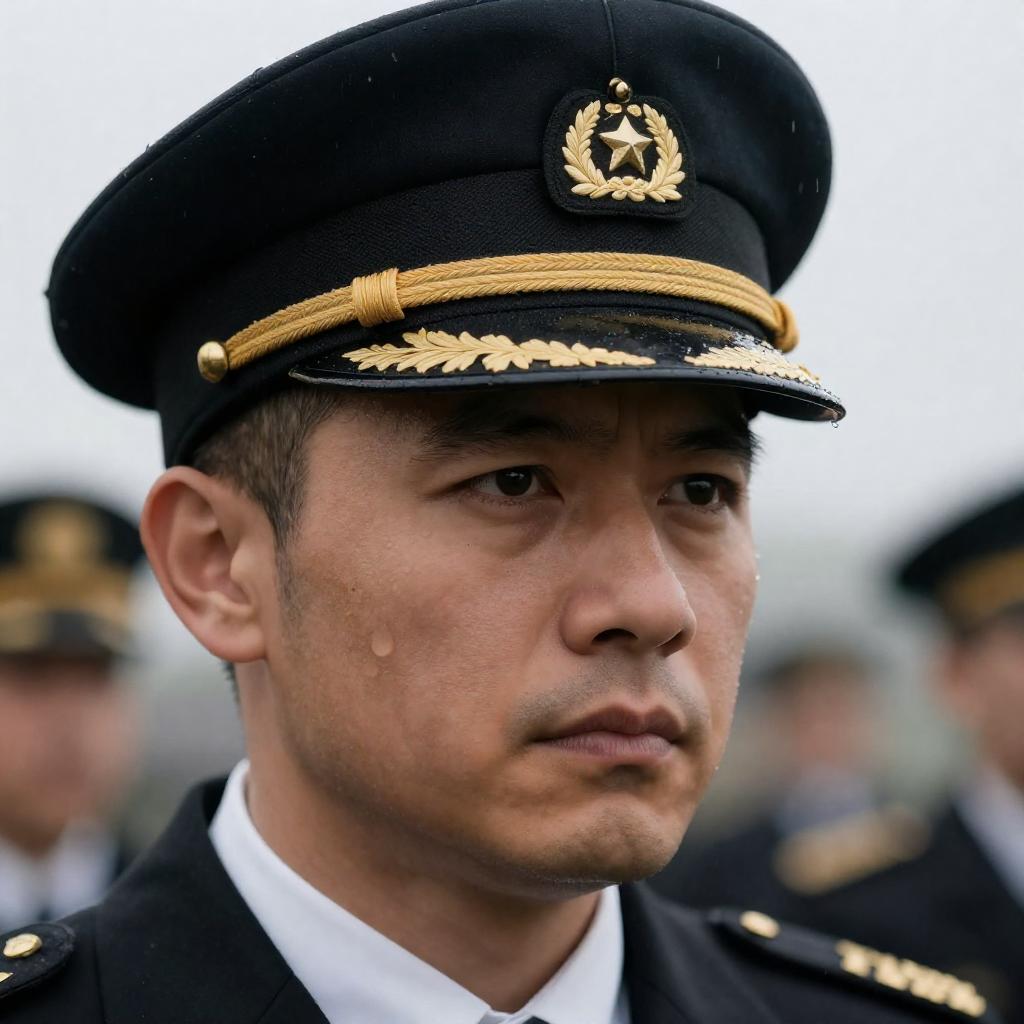 Black-and-white photograph of a man in a naval officer's cap with a detailed insignia, wearing a light-colored turtleneck sweater. He is gripping a metal pipe with his right hand, looking determined. Background includes large industrial machinery and a chain. His expression is intense. The man is in the foreground, partially obscured by machinery.