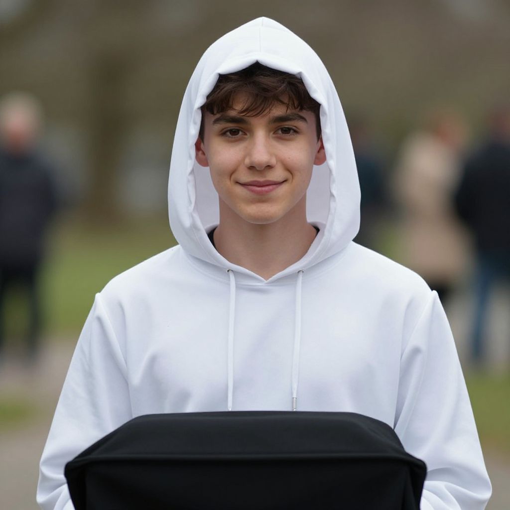 Photograph of a teenage boy with light skin and dark brown hair, wearing a white hoodie with the hood up. He has a slight smile and holds a black rectangular object in front of him. The background is blurred, showing an outdoor park setting with people in dark clothing and trees. The boy's hoodie contrasts with the dark background, making him the focal point. The image has a shallow depth of field, emphasizing the subject while blurring the background.