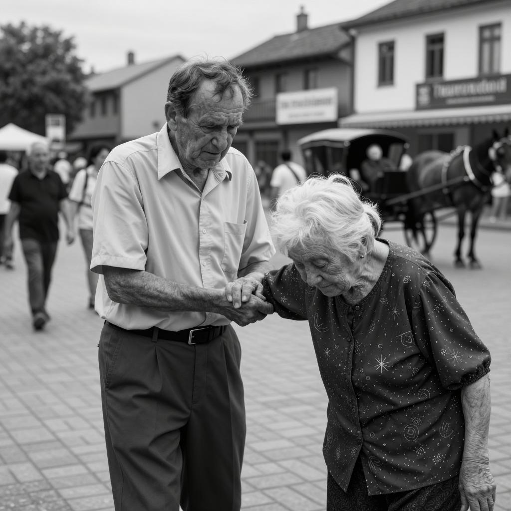 Black-and-white photograph of an elderly man with a long white beard and Santa hat, holding hands with a young girl. The man looks down at the girl, who smiles. The man wears a dark suit, the girl a plaid coat and headscarf. Background is softly blurred.