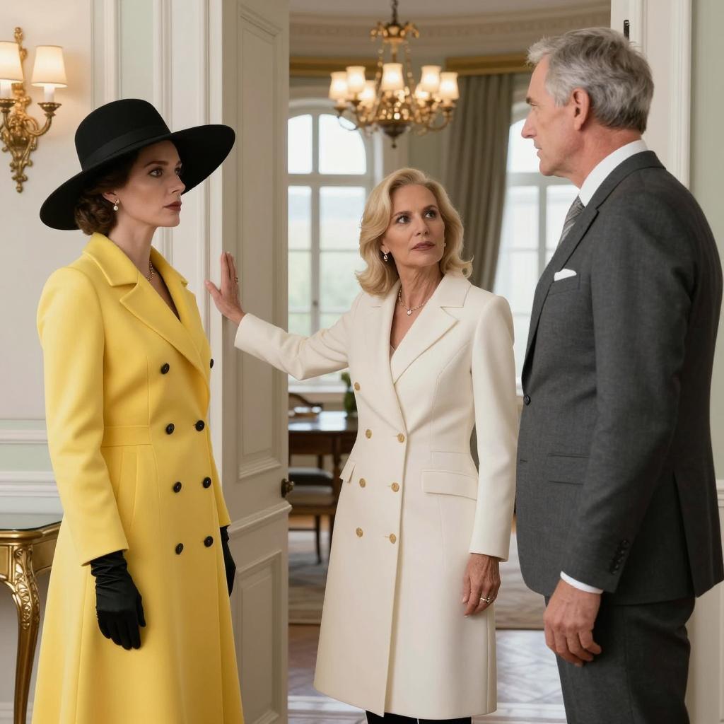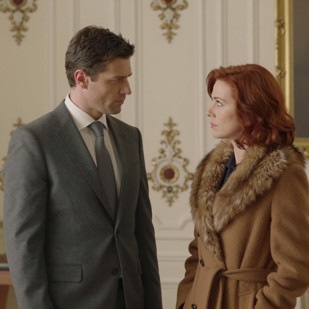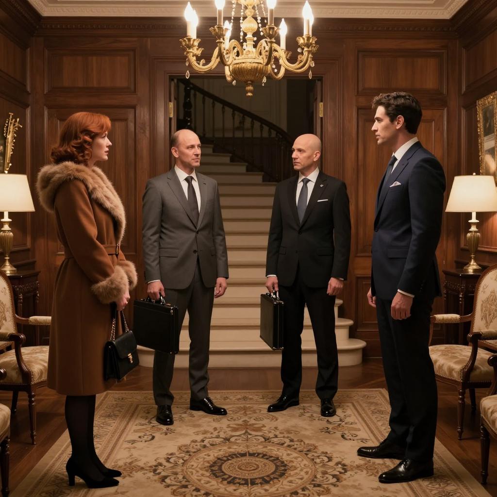 Four people in a luxurious, wood-paneled room. Two men in dark suits with one in a gray suit. One woman in a brown fur-trimmed coat holding a purse. The men stand facing the woman. Grand staircase in the background. Ornate chandelier, upholstered chairs, and an elegant rug. One man has a bald head, the other has dark hair. The woman has red hair. The man in gray holds a briefcase. The man in dark suit with bald head stands closest to the door.