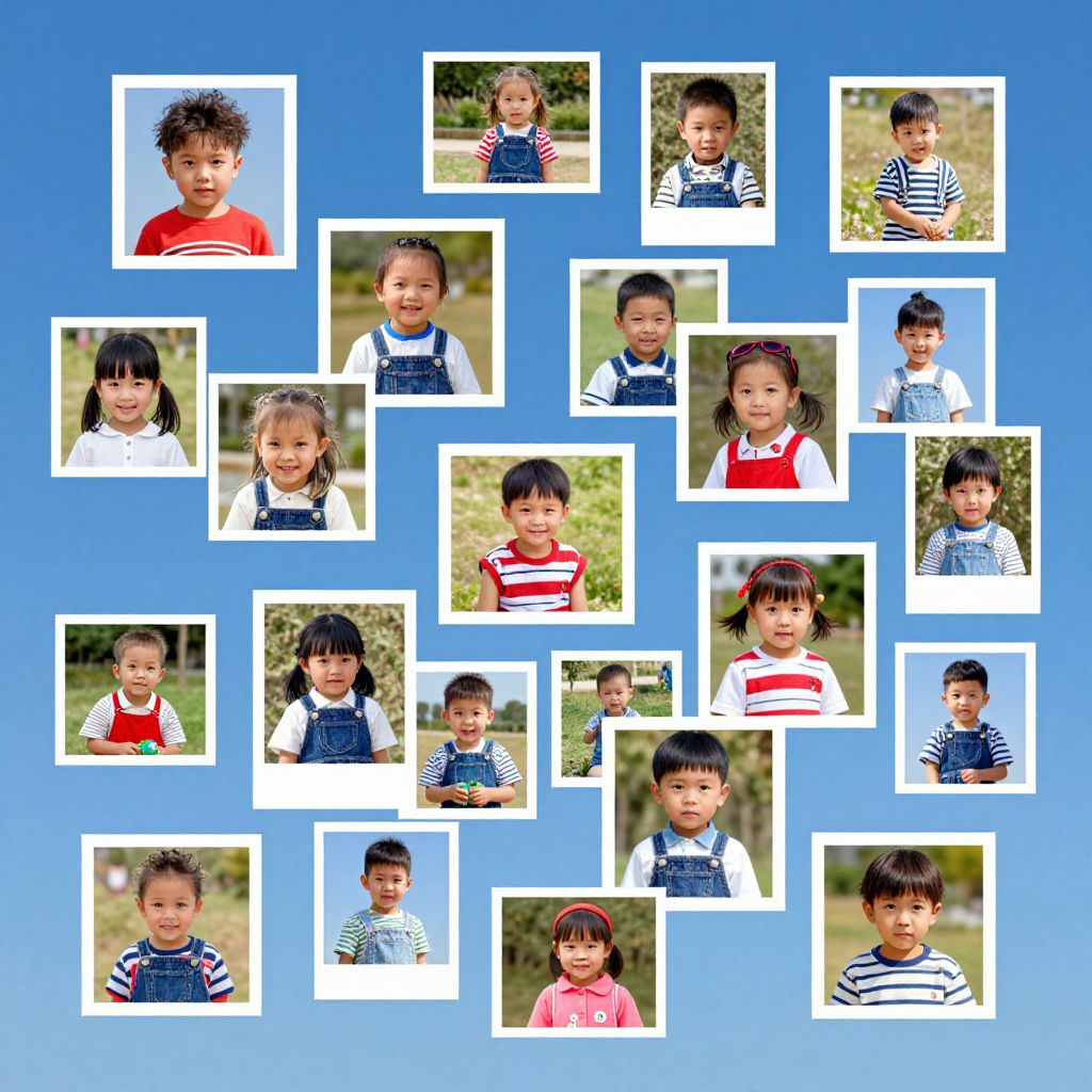 Photograph of a collage of 17 young Asian children, each wearing different colorful clothes, against a blue gradient background.