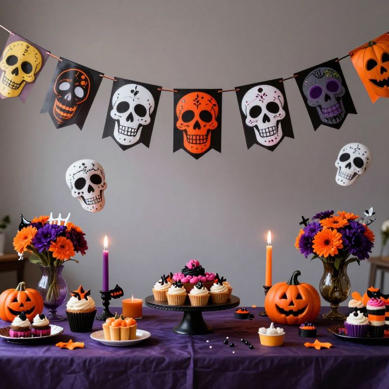 A whimsical Halloween-themed party scene where vibrant skull banners float serenely above a table adorned with colorful treats, flowers, and candles, creating a surreal blend of festivity and fantasy.